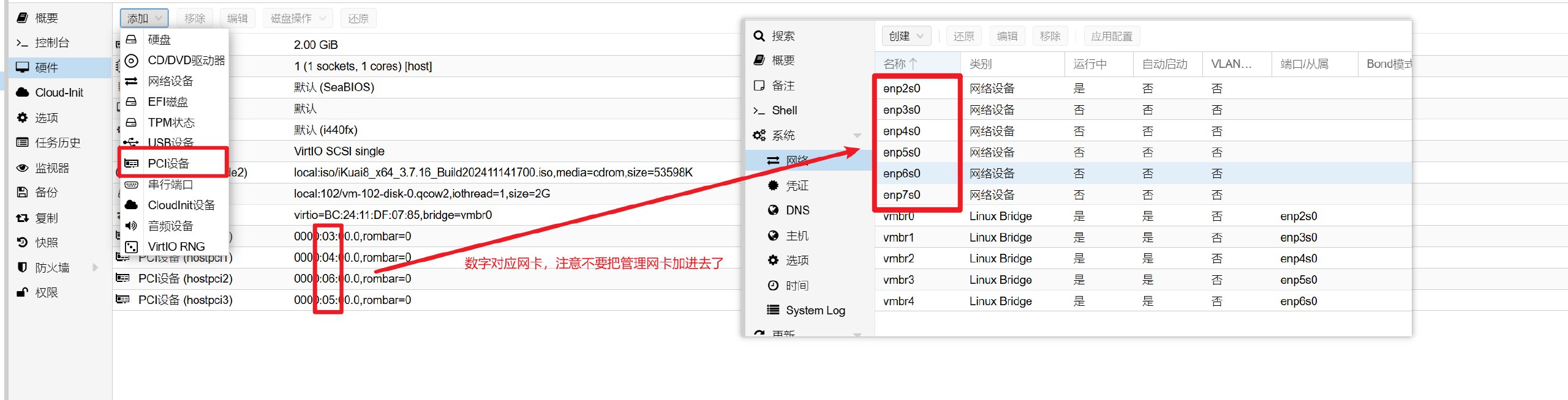 选择【pve】节点-【网络】-【创建】-【Linux Bridgr】,勾选【自动启动】,在桥接端口填入上面 ``enp2s0类似网卡名称,需要用的话都要加上,然后会有